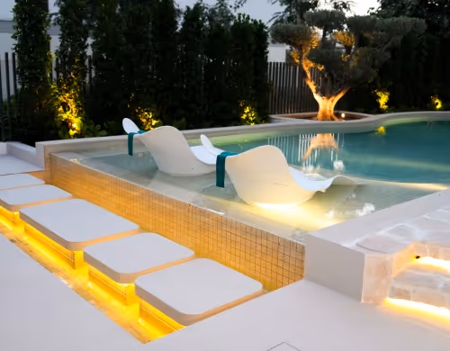 Complete infinity pool, water features, custom pergola kitchen, and fire feature seating creating luxury outdoor entertainment.