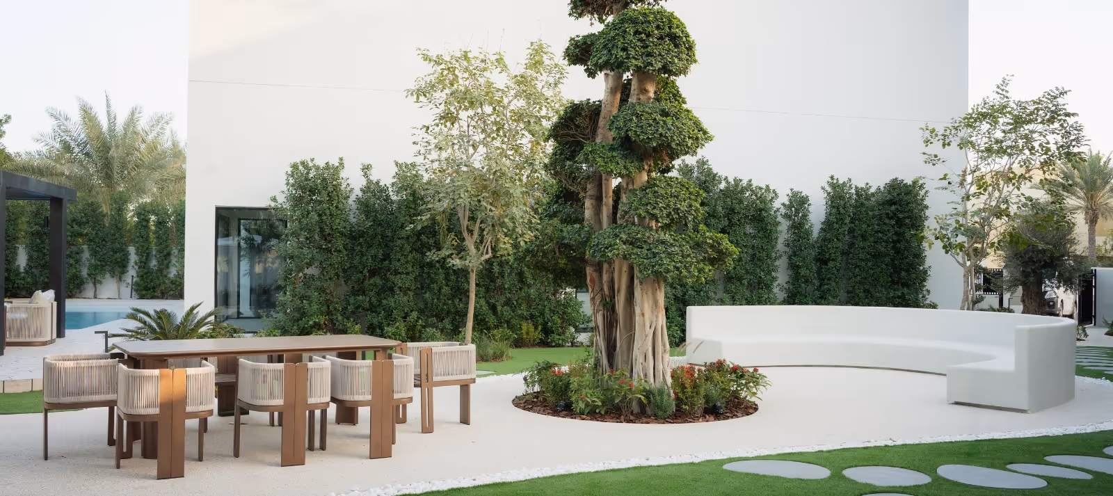 Create Bali-inspired minimalist retreat with organic curves, lush tropical planting, and serene natural palette drawing from Balinese design principles.